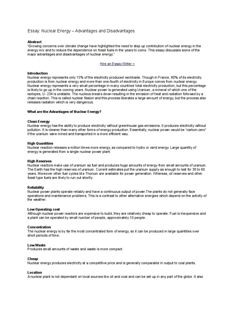 In addition, nuclear power plant essay, the same know-how used to design nuclear power plants can to a certain extent be used to build nuclear weapons nuclear proliferation. Rohrer For all intents and purposes, the argument against the production of nuclear power seems to be the strongest. This is one argument against the production of nuclear powers. With about nuclear power resources in the United States and approximately commercial nuclear power reactors globally, there is a lot of information available regarding nuclear energy generation World Nuclear Association, nuclear power plant essay.